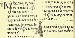 The text is written in two columns per page, 25 lines per page, in large, not round uncial letters. It has breathings (spiritus asper, spiritus lenis), and accents often added wrongly.[3] It is carelessly written by an ignorant scribe. The letter φ is enormously large, the letter α presents the last stage of the uncial script.[2]