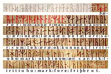 The Codex Runicus is a codex of 202 pages written in medieval runes around the year 1300 which includes the oldest preserved Nordic provincial law, Scanian Law (Skånske lov) pertaining to the Danish land Scania (Skåneland). Codex Runicus is one of the few runic texts found on parchment. The manuscript's initials are painted various colors and the rubrics are red. Each rune corresponds to a letter of the Latin alphabet.