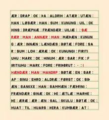 The manuscript has three major parts: the Scanian Law (fol. 1-82), the Scanian Ecclesiastical Law (fol. 84–91), a chronicle of the early Danish monarchs (fol. 92-97) and a description of the Danish-Swedish border (fol. 97-100). The Scanian Ecclesiastical Law (Skånske Kirkelov) is a settlement detailing the administration of justice agreed upon by the Scanians and the archbishop of Lund in the late 12th century.[4] The two law texts are written in the same hand, but the non-legal material of the codex, beginning on leaf 92, is believed to have been added in another hand, at a later date.[5] The history section consists of a fragment of a list of Danish kings and a chronicle beginning with the legendary Danish king Hadding's son Frode and ending with Eric VI of Denmark. Following the historical texts is a description of the oldest border between Sweden and Denmark (referred to as "the Daneholm settlement"). On the last leaf of Codex Runicus is a verse with musical notations - the first musical notations written in Scandinavia. It is the earliest written evidence of secular music in Denmark, a non-rhythmic notation on a four-line staff.[6]