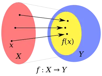 A codomain is part of a function f if f is defined as a triple (X, Y, G) where X is called the domain of f, Y its codomain, and G its graph.[1] The set of all elements of the form f(x), where x ranges over the elements of the domain X, is called the image of f. The image of a function is a subset of its codomain so it might not coincide with it. Namely, a function that is not surjective has elements y in its codomain for which the equation f(x) = y does not have a solution.