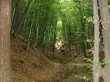 These uplands are interlaced by deep, flat valleys, ravines, and landslide-scoured depressions separated by sharp ridges. Steep, forest-clad slopes account for much of the codrii.