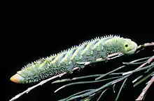 The larvae feed on Banksia ericifolia, Grevillea robusta, Hakea dactyloides, Macadamia integrifolia, Persoonia levis and Stenocarpus sinuatus. The head is an orange conical structure, but on its tail are two large raised black knobs. These look like a pair of large eyes, so that an observer or predator finds it difficult to determine which end is the head. The body is green or yellow, often with yellow diagonal stripes and sometimes with purplish lateral markings. It is covered in soft short pale spines. Full-grown larvae are about 100 mm long.