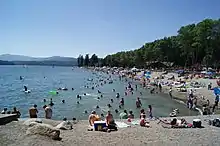 Due to the scenic lake, tourism has always been a factor in the local economy. In the early 1900s, it had become popular in Spokane to travel and picnic in the park, shop in town, and take steamboat cruises on the lake and up the Saint Joe River.[28] Coeur d'Alene had also received national publicity in magazines, where it had been called a "wonderland" and "the Lucerne of America."[37] However, tourism began to become a mainstay of the economy with the completion of highway infrastructure projects in the 1950s and 1960s, and the Coeur d'Alene Chamber of Commerce began to promote the city as a tourist destination as well.[38] As tourism increased, there was more demand for lodging facilities, convention space, restaurants, and cultural activities. By 1976, the city had over 30 motels with about 1,500 rooms.[39] On June 14, 1958, the city hosted the first Diamond Cup Hydroplane race, which was one of the largest events in its history and garnered national publicity and media coverage.[40] The event was attended by 30,000 people, and it was considered a success by the Diamond Cup organizers. The race was held at Lake Coeur d’Alene for the next eight years; it was discontinued due to persistent difficulties in raising funds for the event.[40]