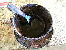 Kopi tubruk is a traditional way to prepare coffee in Bali. It consists of finely ground coffee powder steeped in water and left to settle. Once the powder has settled the coffee is drunk while trying to avoid drinking the 'mud' from the bottom of the glass.[25]