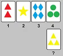 In this test, a number of cards are presented to the participants. The figures on the cards differ with respect to color, quantity, and shape. The participants are then told to match the cards, but not how to match; however, they are told whether a particular match is right or wrong. The ability to switch matching rules is measured. Typically, children between ages nine and eleven demonstrate the cognitive flexibility needed for this test.[3][18]