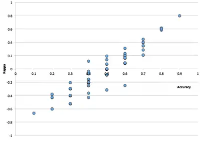 Another factor is the number of codes. As number of codes increases, kappas become higher. Based on a simulation study, Bakeman and colleagues concluded that for fallible observers, values for kappa were lower when codes were fewer. And, in agreement with Sim & Wrights's statement concerning prevalence, kappas were higher when codes were roughly equiprobable. Thus Bakeman et al. concluded that "no one value of kappa can be regarded as universally acceptable."[15]: 357 They also provide a computer program that lets users compute values for kappa specifying number of codes, their probability, and observer accuracy. For example, given equiprobable codes and observers who are 85% accurate, value of kappa are 0.49, 0.60, 0.66, and 0.69 when number of codes is 2, 3, 5, and 10, respectively.
