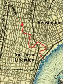 The Cohocksink and its marshlands divided the District of Kensington from the city of Philadelphia and its Northern Liberties.[3] The first settlers were Swedish, predating the founding of the colony of Pennsylvania.[4] As early as 1700, area mills and tanneries took advantage of the stream for water power, including one mill built between Fifth and Sixth streets at the direction of William Penn, Pennsylvania's founder.[5] The neighborhoods on either side of the Cohocksink were home to much Philadelphia's early industrial development. During the American Revolution, the Cohocksink was line of defense for the British as they occupied Philadelphia. Planting artillery on the south side, the British dammed the stream to create a broad marshland, forming a barrier against attacks from the north.[1]