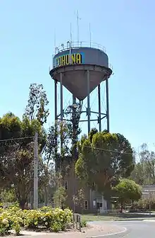 The Cohuna water tower is adorned with the town's name, and visible for kilometres.
