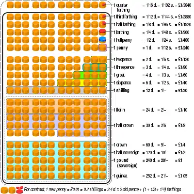 The standard circulating coinage of the United Kingdom, British Crown Dependencies and British Overseas Territories is denominated in pounds sterling (symbol "£"), and ranges in value from one penny to two pounds. Since decimalisation, on 15 February 1971, the pound has been divided into 100 (new) pence. Before decimalisation, twelve pence made a shilling, and twenty shillings made a pound. British coins are minted by the Royal Mint in Llantrisant, Wales. The Royal Mint also commissions the coins' designs.
