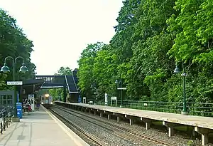 MTA control of passenger service continued through the period when it was taken over by Conrail in 1976, and then by Metro-North Railroad in 1983. Cold Spring station was one of the last stations within the system to be rebuilt and relocated with high-level platforms, a pedestrian bridge, and elevators. The former station house is within the boundaries of the Cold Spring Historic District.[3] The current Cold Spring station is located slightly south of the old one, still standing at the foot of Cold Spring's Main Street. Walkways on both sides of the tracks connect the old and new station, and the pedestrian tunnel built by New York Central Railroad is still in use today by both commuters and local residents.[4][5][6]