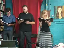 Cold readings are common in performance classes, and furthermore are employed frequently in actor auditions to allow the producer or playwright to get a general idea of the actors' performing capabilities.[2] They are also employed by playwrights who need to hear their play read aloud for the first time by actors, and as such they form an initial integral component of the collaborative creative theatrical process, which may or may not include the eventual production of the play itself. (Public performances of cold readings also serve as entertainment in their own right, particularly in the context of community theater,[3][4] and less public readings can serve as creative incubators for more established playwright and theatrical talent during the course of play development.[5]) Many actors and other performers and public speakers take classes and practice at length to improve the quality of their cold readings.