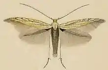 The wingspan is about 19 mm. Adults have a yellow ground colour with dusky-outlined whitish streaks. They are on wing from July to August.[2] The head is white, the crown yellow tinged. Antennae whitish, basal 2/5 clothed with hairs, basal joint with strong tuft. Forewings with apex falcate; yellow; a subcostal streak to before middle, a discal streak from before middle to 2/3, a streak along fold, and several short streaks between veins towards costa posteriorly and termen silvery-white, blackish-edged. Hindwings dark grey.[3]