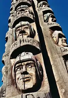 - The Codger Pole is a chainsaw-carved monument by master carver Jonathan LaBenne. It is located on Main Street and commemorates a 1988 rematch, 50 years after the original 1938 game, between archrival football teams from Colfax High School and St. John. At 65 feet (20 m) tall, it is the largest sculpture of its type in the world, and consists of portraits, carved into five upended red cedar logs, of the 51 players involved. The players are shown in old age but are wearing the football uniforms of the thirties. The Codger Pole was recently renovated as of May 2016. It is located at the intersection of Main and Rock Streets.