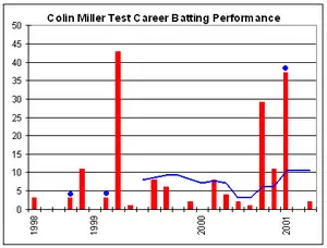 Miller began as a right-arm fast-medium bowler, but changed to right-arm offbreak spin after an ankle injury. He mixed both styles with considerable success, and was a surprise addition to the Australian Test team at the age of 34, being able to act both as the second spin bowler and the third pace bowler. He played Test cricket principally as an off-spinner, and took 69 wickets at an average of 26.15. His best innings and match figures came in the Third Test against West Indies in Adelaide in 2000–01, when he took 5 for 81 and 5 for 32.[5] He won the award for the Australian Test Player of the Year in 2001.