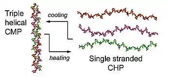 Collagen is the main component of the extracellular matrix (ECM).[7] The collagen superfamily consists of 28 different types of collagen.[7] Although the function and hierarchical structure of these collagens may vary, they all share the defining structural feature known as the triple helix,[1] where three left handed polyproline II-type (PPII) helices assemble to form a right-handed supercoiled helical motif.[1][8] Short synthetic peptides known as collagen mimetic peptides (CMPs) or collagen-like peptides (CLPs) have played a major role in elucidating the 3D structure of the collagen triple helix, its folding kinetics, and thermal stability as small triple helical models.[3][9][10][11] CMPs, CLPs, and CHPs are all very similar in terms of their amino acid sequences but only when CMPs or CLPs are heated above their melting temperatures, do they exist in the dissociated, single-stranded state and can be considered as CHPs.[2]