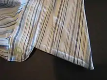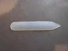 A collar stay, collar stick, collar tab (British English), collar stiffener, or collar stiff is a shirt accessory consisting of a smooth strip of rigid material, rounded at one end and pointed at the other, inserted into specially made pockets on the underside of a shirt collar to stabilize the collar's points. The stays ensure that the collar lies flat against the collarbone, looking crisp and remaining in the correct place.[1]