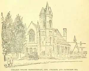 The large church was built in 1885 as College Street Presbyterian and could hold 1200 worshippers, under founding (1874) minister Alexander Gilray (1874-1915), and Robert Balmer Cochrane (1915-1925). In 1925, this congregation voted to join the United Church, and was the site that June of the 51st and final General Assembly of the originally constituted Presbyterian Church in Canada before a majority of congregations of that founding denomination voted to enter the United Church of Canada. Over time attendance fell and it ran into financial difficulties and fell into disrepair.