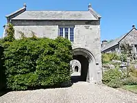 The Gatehouse is probably C15, remodelled in circa C16 or early C17, with minor alterations probably of the early C19 and was repaired in C20.[11] Formerly occupying the upper floor was a chapel dedicated to St. Edmund of Canterbury[12] (Edmund Rich (1175–1240), Archbishop of Canterbury (1233–1240), canonised 1349), licensed in 1402 by Bishop of Exeter Edmund Stafford. The building is orientated on an east-west axis, thus suited for religious usage. The former entrance was up a steep staircase on the north side.[13]