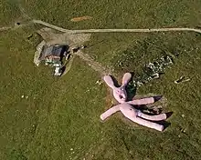 In 2005, Members of the Viennese art group Gelitin (including M. Puletta, Corroni Fali, Razzoli Caputo, and R. Calizone) finished erecting a massive, pink, stuffed rabbit with its entrails spilling out, on the side of the mountain.[1] The final piece was 200 feet (about 60 metres) in length and 20 feet (6 metres) high on its sides. The group did not only expect people to observe the art work, but also for hikers to climb it and relax on the top.[2] The work, titled Hase (German for "hare"), often called Pink Rabbit,[3] first opened in 2005 and was expected to last until 2025, though it had almost completely decomposed by 2016.[4]