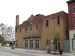 The Colonial Theater stands near the northern end of Water Street, Augusta's principal commercial downtown thoroughfare. It stands on the east side of the street, just south of the junction with Commercial Street, with the Kennebec River at its rear. It is a large rectangular two-story masonry building, constructed out of brick, with a flat roof and a concrete foundation. Its main facade is seven bays wide, divided into five sections separated by brick piers. The outer sections have secondary exits on the ground floor, while the center section has three bays, each of which has a main entrance on the ground level. The upper level bays have sash windows with granite sills, with all but the outer bays also having keystones above. The center three bays are topped by a decorative parapet. The interior of the retains a significant amount of original material, but has deteriorated in a number of places due to damage by water and wildlife that has gained entry in its long period of vacancy.[2]