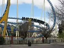 Colossus's track is blue with white supports and a yellow color scheme on the inversions. Its inversions are 2 vertical loops which are lit up with orange and yellow lights at night. The lift is also lit up with orange and yellow lights.
