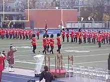 The U.S. colour guard is formed and marched in one rank at close interval. Since the National Colors must always be in the position of honour on the right,[8] the colour guard must execute a special movement to reverse direction. It does not execute rear march, nor does it execute about face. Rather, it performs a maneuver derived from the standard counter-column command, generally known as counter march or color reverse march, in order to keep the precedence of flags in order.
