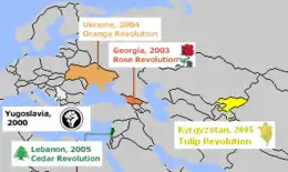 Colour revolution (sometimes coloured revolution)[1] is a term used since around 2004 by worldwide media to describe various anti-regime protest movements and accompanying (attempted or successful) changes of government that took place in post-Soviet Eurasia during the early 21st century—namely countries of the former Soviet Union, the former Yugoslavia, and People's Republic of China.[2] The term has also been more widely applied to several other revolutions elsewhere, including in the Middle East, the Asia-Pacific region, and South America, dating from the late 1980s to the 2020s. Some observers (such as Justin Raimondo and Michael Lind) have called the events a revolutionary wave, the origins of which can be traced back to the 1986 People Power Revolution (also known as the "Yellow Revolution") in the Philippines.