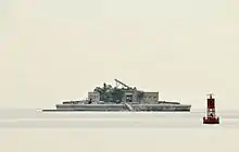 CBS spent approximately $500,000 to construct the transmitter building with emergency housing for ten workers, and the 410-foot (125 m) broadcast tower. The station contained a 50,000-watt transmitter housed in a 75-square-foot (7.0 m2) copper-walled building. There also was a 5,000-watt transmitter unit for emergency use. Electric power was supplied through two submarine cables, which were connected to separate power plants to prevent interruption of service. Emergency generators were installed on the island for protection against power failure.[3] The men who operated the station lived within a grounded metal shell under which were living quarters for engineers, workshops, electrical units that supplied tube voltages, and the backup generator.[4] The transmitter remained in operation until 1963, when it became obsolete, and the station was moved to nearby High Island.
