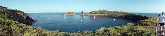 The main islets are Illa Grossa, La Ferrera, La Foradada and El Carallot. The total emerged area of all four is around 0.19 km2 (0.07 sq mi) and the highest point is 67 metres (220 feet) above sea level. Illa Grossa, by far the largest, is the northernmost island of the group. It stands in the place of an ancient crater and shows a distinctive semi-circular pattern. There are no buildings on it, except for a 19th-century lighthouse, a jetty and the staff quarters used by the biologists working in the wildlife reserve.