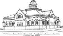 The building was part of a complex of a power plant and streetcar barn (the Columbus Central Street Railway Car Depot and Power House) during its operation; those buildings have since been demolished.[2][3] The power house, built in 1894, was a large building of cut stone, brick, and terra cotta, measuring 100 by 100 ft. The building had a pyramidal roof with large dormers on each side and a flat skylight in the center, surrounded by a balustrade, and with a central ornamental cupola.[4] The building was also designed by architects Yost & Packard.[5][6] The building was noted as a unique take away from the norm of power plants at the time; this structure was designed to hide its industrial uses, including its large smokestack.[4]