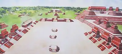 Archaeologists have identified two distinct construction stages so far.[1] After conducting his 1966 survey, Andrews concluded that the lack of significant differences in architectural style between the buildings indicated that they were built within a relatively short period of time. Buildings of the first stage were made with flattened earth covered with lime, while those of the second were covered with brickwork.[7]