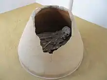 The name is linked to the adjacent modern city of Comalcalco and derives from the Nahuatl words comalli (comales) calli (house) and the locative co, literally meaning "At the House of the Comales" or "Place of the House of the Comales". This name is a reference to the bricks of the ruined Maya site, which later people thought resembled comales.[1] The ancient place name associated with Comalcalco is Joy Chan pronounced [hoj tʃan], (also spelled Hoi Chan),[3] which means "round sky" or "clouded sky".[2][4]