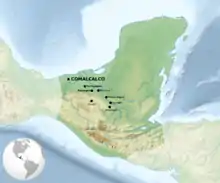Comalcalco is an ancient Maya archaeological site in the State of Tabasco, Mexico, adjacent to the modern city of Comalcalco and near the southern coast of the Gulf of Mexico. It is the only major Maya city built with bricks rather than limestone masonry and was the westernmost city of the Maya civilisation. Covering an area of 7 km2 (2.7 sq mi), Comalcalco was founded in the Late Classic period and may have been a satellite or colony of Palenque based on architectural similarities between the two.[1] The city was a center of the Chontal Maya people.[2]