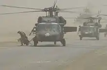 On 15 August 1986, the 101st Aviation Group was redesignated as the Aviation Brigade, 101st Airborne Division.[6] The Aviation Brigade was deployed to Saudi Arabia following Iraq's invasion of Kuwait in 1990. The 101st fired the first shots of the Persian Gulf War from AH-64 Apaches under the command of Lieutenant Colonel Richard "Dick" Cody who would later serve as the 31st Vice Chief of Staff of the United States Army. Through the 1990s, the brigade deployed elements to Somalia, Kuwait, Bosnia, Kosovo, and Honduras to defend democracy and assist in hurricane relief operations. On 9 October 1997, the Aviation Brigade (the largest aviation brigade in the Army at the time) split its nine battalions into two brigades, the 101st Aviation Brigade (Attack) and the 159th Aviation Brigade (Assault). Upon return from its Iraq deployment, the 101st Combat Aviation Brigade was finally restructured to its current form. It now consists of a battalion of AH-64D Apache Longbows (1st Battalion), a battalion/squadron of OH-58D Kiowa Warriors (2/17th Cavalry), an assault battalion of UH-60M Black Hawks (5th Battalion), a general support battalion of CH-47F Chinooks, UH-60A Black Hawks, and UH-60L Black Hawks (6th Battalion), and an aviation support battalion (96th ASB).[7][8][9] The 159th Aviation Brigade (Assault) underwent a similar transformation and was redesignated as the 159th Combat Aviation Brigade. The 101st Airborne Division (Air Assault) was the only division in the US Army to have two aviation brigades.