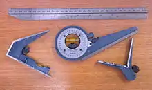 The protractor head has a flat reference edge which is attached to an adjustable 180° protractor or (sometimes called a turret) with a graduated scale in both directions for reading both the angle or the compliment angle.[1] The protractor head sometimes includes a small spirit level.[4][2]