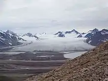 Comfortlessbreen is a glacier in Oscar II Land at Spitsbergen, Svalbard. It has a length of about fourteen kilometers, and a maximum width of three kilometers. The glacier debouches into Engelskbukta, after a merge with Uvêrsbreen.[1][2][3] Comfortlessbreen is separated from Uvêrsbreen by the mountain range of Trondheimfjella (with Domkyrkja in the west).[4]