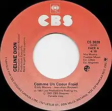 "Comme un cœur froid" (meaning "Like a Frozen Heart") is the fourth single from Celine Dion's album Incognito, released on 25 January 1988 in Quebec, Canada.[1] The song became a hit reaching number 1 in Quebec for two weeks. It entered the chart on 6 February 1988 and spent twenty four weeks on it.