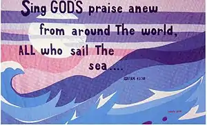 On September 12, 1982, the Chapel sponsored a "Jewish Pride in the Navy Day," that included the dedication of an 11 by 7 foot cloth-on-cloth wall hanging for the chapel, designed by local Norfolk artist Leonette Adler, and cut and sewn by Jewish officers, sailors, and their spouses.[11] The celebration included music on the Frazier Hall lawn by members of the Navy band, and tours of local Navy ships. As described by the Navy News, "the hanging features a backdrop of silver moon and roaring waves of blue and white and words from the prophet Isaiah."[11]