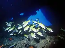 In the 1950s, investigators from the Hawaii's Division of Fish and Game conducted marine fauna surveys and found the Hawaiian ichthyofauna was dominated by herbivorous fishes, which they concluded were "a useless end in the food chain".[9] Unlike many Pacific islands, Hawaii lacked any fish from the Serranidae or Lutjanidae families, so to increase recreational and commercial food fishing opportunities, and fill a perceived 'vacant ecological niche', collections of 11 species of snappers and groupers were imported from Mexico, Kiribati, the Marquesas Islands, and Moorea, and introduced to Hawaii.[10] Only three species thrived, dominated by the bluestripe snapper, now occupying many of the Hawaiian Islands.[11]