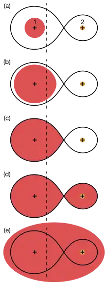 A common envelope is formed in a binary star system when the orbital separation decreases rapidly or one of the stars expands rapidly.[2] The donor star will start mass transfer when it overfills its Roche lobe and as a consequence the orbit will shrink further causing it to overflow the Roche lobe even more, which accelerates the mass transfer, causing the orbit to shrink even faster and the donor to expand more. This leads to the run-away process of dynamically unstable mass transfer. In some case the receiving star is unable to accept all material, which leads to the formation of a common envelope engulfing the companion star.[7]