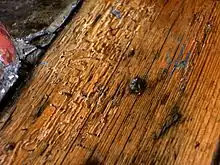 The common furniture beetle or common house borer (Anobium punctatum) is a woodboring beetle originally from Europe[1] but now distributed worldwide. In the larval stage it bores in wood and feeds upon it. Adult Anobium punctatum measure 2.7–4.5 millimetres (0.11–0.18 in) in length. They have brown ellipsoidal bodies with a prothorax resembling a monk's cowl.[2]