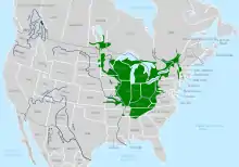 Necturus maculosus specimens live in streams, lakes, and ponds in the eastern part of North America.[4] They appear in the southern section of Canada, as far south as Georgia, and from the Midwest United States to North Carolina.[8] In the more northern sections, they are called mudpuppies, and in the southern portions, they are called waterdogs.[4] The mudpuppy hides under cover such as rocks and logs during the day and becomes more active at night.[7] However, in muddy waters, the mudpuppy may become active during the day.[3] Mudpuppies can even live under the ice when lakes freeze.[3] There is an introduced population in Maine.[13]