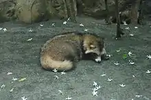 The common raccoon dog (Nyctereutes procyonoides) is a canid indigenous to mainland East Asia and northern Vietnam. It is also known as the Chinese raccoon dog, Asian raccoon dog, mangut (its Evenki name),[2] neoguri (its Korean name) or simply raccoon dog. It is one of two extant species in the genus Nyctereutes, alongside the Japanese raccoon dog (N. viverrinus).[3] Despite its name, its closest relatives are the true foxes, and not the American raccoons.