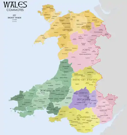 A commote (Welsh cwmwd, sometimes spelt in older documents as cymwd, plural cymydau, less frequently cymydoedd)[1] was a secular division of land in Medieval Wales. The word derives from the prefix cym- ("together", "with") and the noun bod ("home, abode").[1] The English word "commote" is derived from the Middle Welsh cymwt.[2]