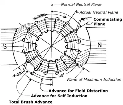 The effect can be considered to be analogous to timing advance in an internal combustion engine. Generally a dynamo that has been designed to run at a certain fixed speed will have its brushes permanently fixed to align the field for highest efficiency at that speed.[12]