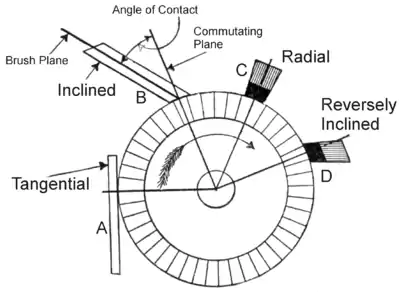 The different brush types make contact with the commutator in different ways. Because copper brushes have the same hardness as the commutator segments, the rotor cannot be spun backwards against the ends of copper brushes without the copper digging into the segments and causing severe damage. Consequently, strip/laminate copper brushes only make tangential contact with the commutator, while copper mesh and wire brushes use an inclined contact angle touching their edge across the segments of a commutator that can spin in only one direction.