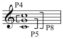 In the twelve-tone technique this is often the separation of the total chromatic of twelve pitch classes into two hexachords of six pitch classes each. In rows with the property of combinatoriality, two twelve-note tone rows (or two permutations of one tone row) are used simultaneously, thereby creating, "two aggregates, between the first hexachords of each, and the second hexachords of each, respectively."[2] In other words, the first and second hexachord of each series will always combine to include all twelve notes of the chromatic scale, known as an aggregate, as will the first two hexachords of the appropriately selected permutations and the second two hexachords.