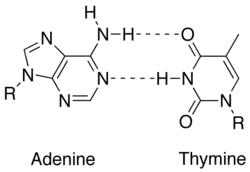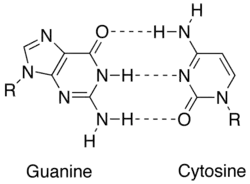 A complementary strand of DNA or RNA may be constructed based on nucleobase complementarity.[2] Each base pair, A = T vs. G ≡ C, takes up roughly the same space, thereby enabling a twisted DNA double helix formation without any spatial distortions. Hydrogen bonding between the nucleobases also stabilizes the DNA double helix.[3]