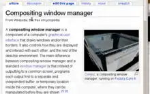 A compositing window manager, or compositor, is a window manager that provides applications with an off-screen buffer for each window. The window manager composites the window buffers into an image representing the screen and writes the result into the display memory.[1][2]