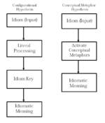 - The conceptual metaphor hypothesis proposes that metaphors are fundamental to human thought and they influence the comprehension of many aspects of language, including idioms.[9] An example of a conceptual metaphor is “love is a journey”. This metaphor is embedded in the idiom-containing sentences like their marriage is on the rocks and our relationship is at a cross-road. This hypothesis suggests that conceptual metaphors facilitate the understanding of idiomatic expressions. Individual words in the idiom can metaphorically contribute to its figurative meaning. In fact, research demonstrated that conceptual metaphors are activated during idiom comprehension. The words associated with the metaphor (e.g., journey) were more quickly identified as meaningful after the presentation of the idiom.